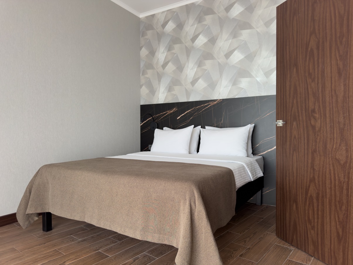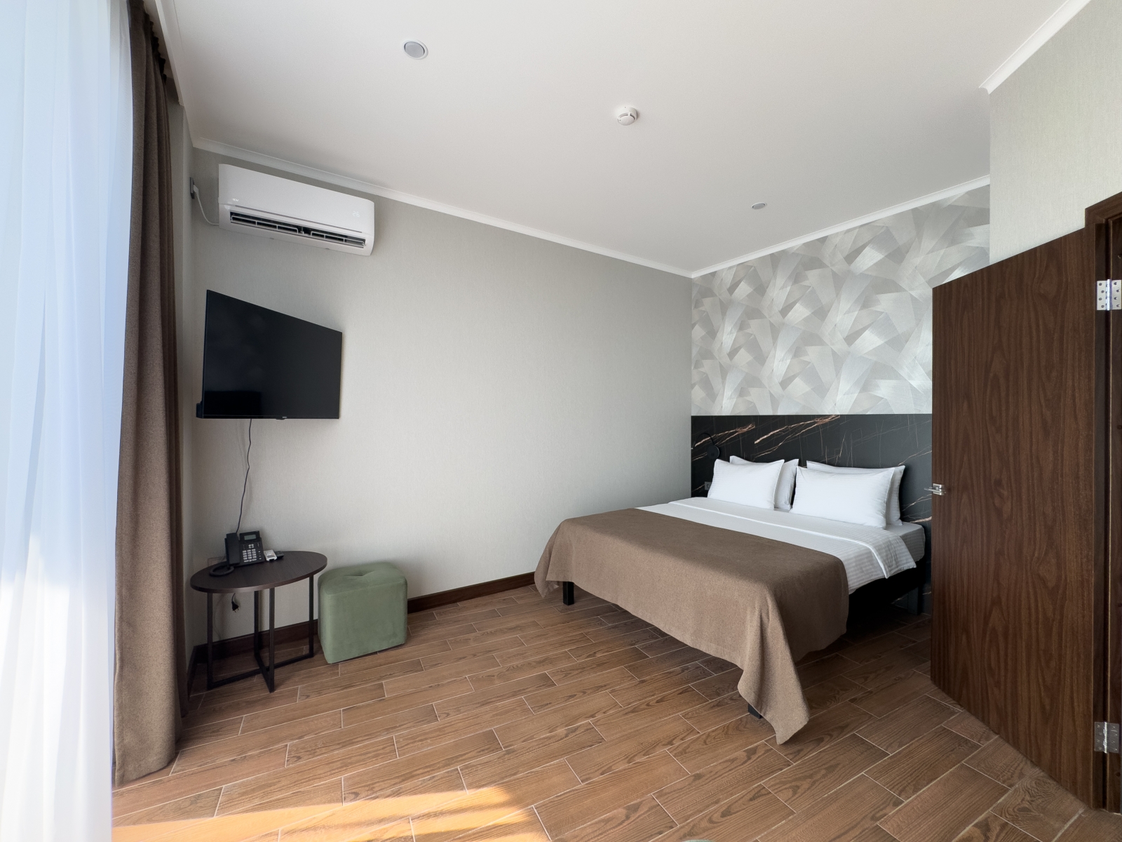 Площадь номера - 50 кв.м. 2 осн. места. 1 доп. место. Мебель: вешалка, зеркало, кровать двуспальная, прикроватные тумбочки, стол, стул, шкаф. Оборудование: гладильная доска, кондиционер, сушилка для белья, телевизор, утюг, чайный набор посуды, электрочайник. Санузел: с душевой кабиной, тапочки, туалетные принадлежности, фен, халат. Сервис: Wi-Fi бесплатно, смена полотенец, смена постельного белья, уборка номера, услуги внутренней телефонной связи.